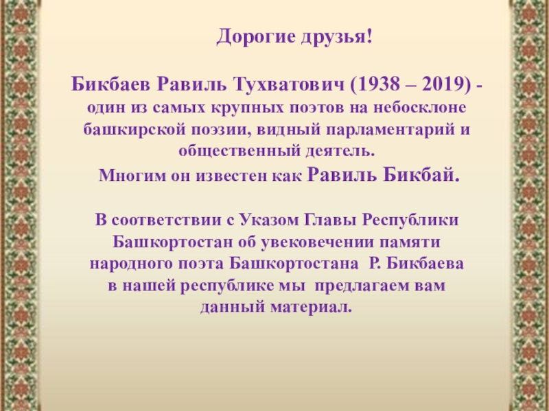 башкирской поэзии, видный парламентарий и общественный деятель.