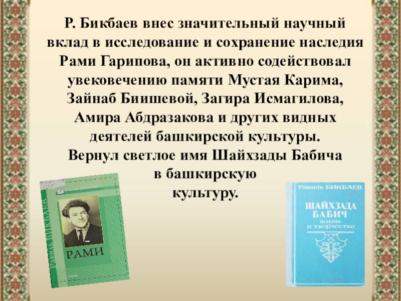 Слайд 5Р. Бикбаев внес значительный научный вклад в исследование и сохранение