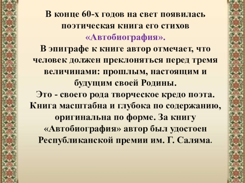 Книга масштабна и глубока по содержанию, оригинальна по форме. За книгу «Автобиография» автор был удостоен Республиканской премии им. Г. Саляма.