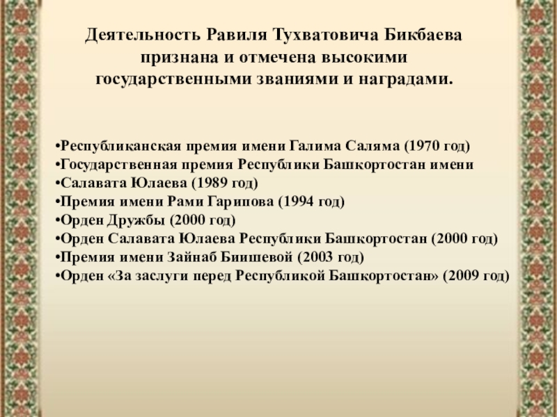 Слайд 14Деятельность Равиля Тухватовича Бикбаева признана и отмечена высокими государственными званиями