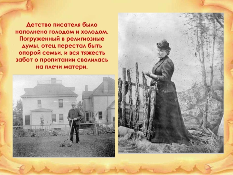 Слайд 5Детство писателя было наполнено голодом и холодом. Погруженный в религиозные