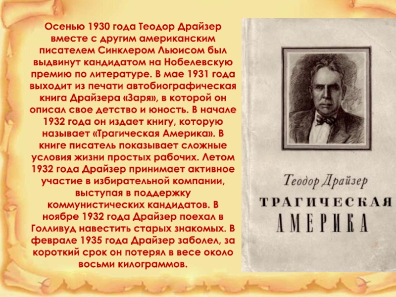 В мае 1931 года выходит из печати автобиографическая книга Драйзера «Заря», в которой он описал свое детство и юность. В начале 1932 года он издает книгу, которую называет «Трагическая Америка». В книге писатель показывает сложные условия жизни простых рабочих. Летом 1932 года Драйзер принимает активное участие в избирательной компании, выступая в поддержку коммунистических кандидатов. В ноябре 1932 года Драйзер поехал в Голливуд навестить старых знакомых. В феврале 1935 года Драйзер заболел, за короткий срок он потерял в весе около восьми килограммов.