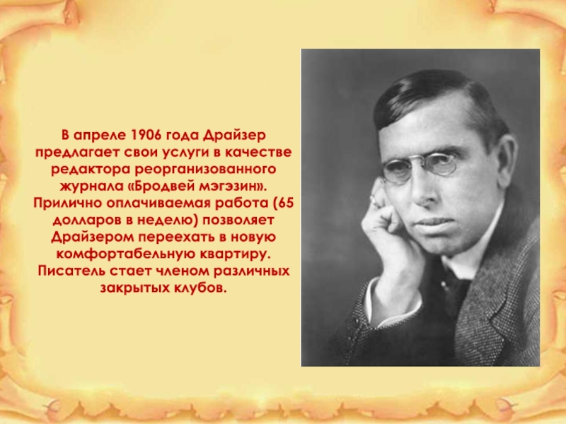 Слайд 15В апреле 1906 года Драйзер предлагает свои услуги в качестве
