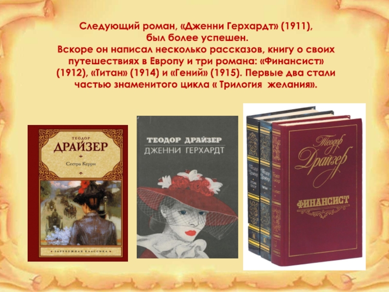 три романа: «Финансист» (1912), «Титан» (1914) и «Гений» (1915). Первые два стали частью знаменитого цикла « Трилогия желания».