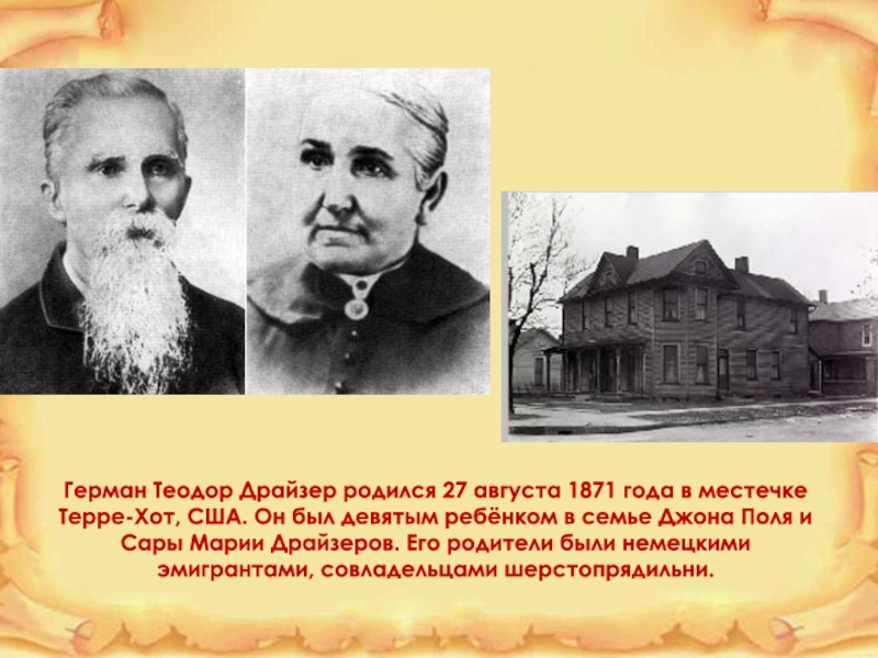 Слайд 3Герман Теодор Драйзер родился 27 августа 1871 года в местечке