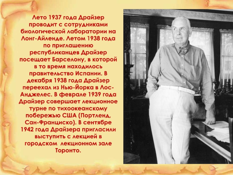 Слайд 19Лето 1937 года Драйзер проводит с сотрудниками биологической лаборатории на