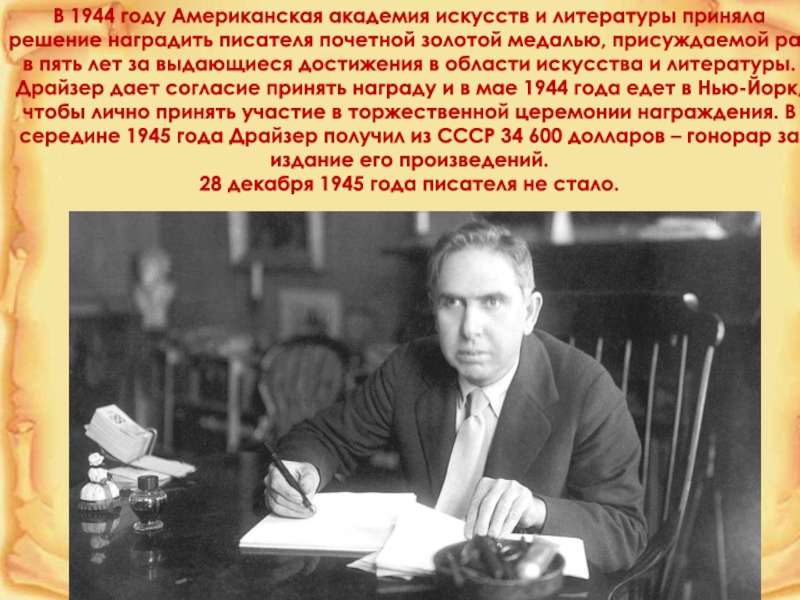за выдающиеся достижения в области искусства и литературы. Драйзер дает согласие принять награду и в мае 1944 года едет в Нью-Йорк, чтобы лично принять участие в торжественной церемонии награждения. В середине 1945 года Драйзер получил из СССР 34 600 долларов – гонорар за издание его произведений.