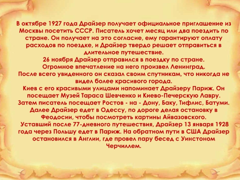 Слайд 16В октябре 1927 года Драйзер получает официальное приглашение из Москвы