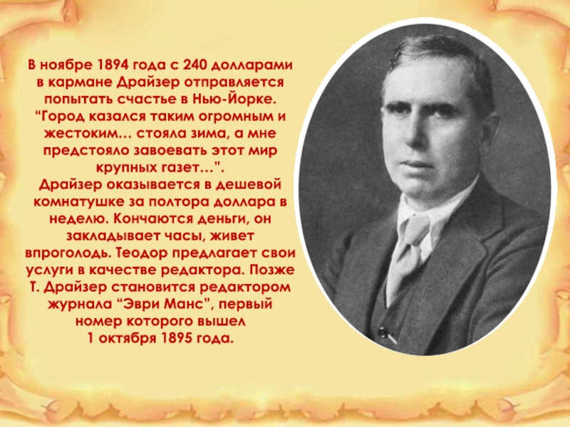 Слайд 10В ноябре 1894 года с 240 долларами в кармане Драйзер