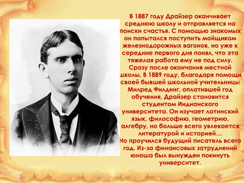 Слайд 7В 1887 году Драйзер оканчивает среднюю школу и отправляется на