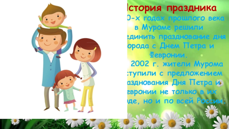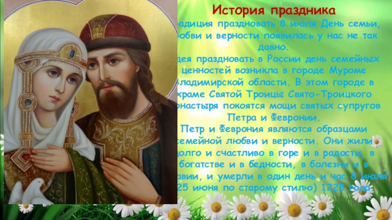 день семейных ценностей возникла в городе Муроме Владимирской области. В этом городе в храме Святой Троицы Свято-Троицкого монастыря покоятся мощи святых супругов Петра и Февронии.
