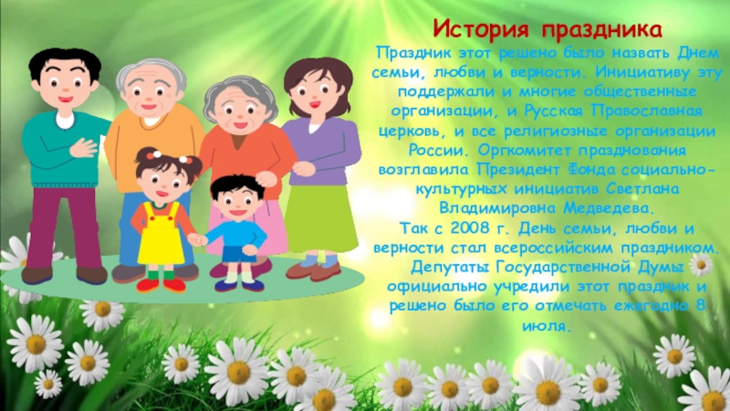Так с 2008 г. День семьи, любви и верности стал всероссийским праздником. Депутаты Государственной Думы официально учредили этот праздник и решено было его отмечать ежегодно 8 июля.