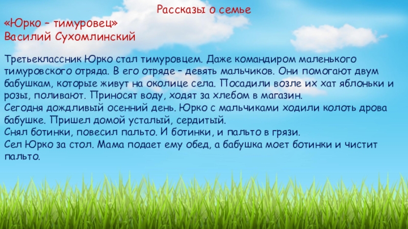 Сегодня дождливый осенний день. Юрко с мальчиками ходили колоть дрова бабушке. Пришел домой усталый, сердитый.