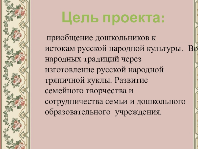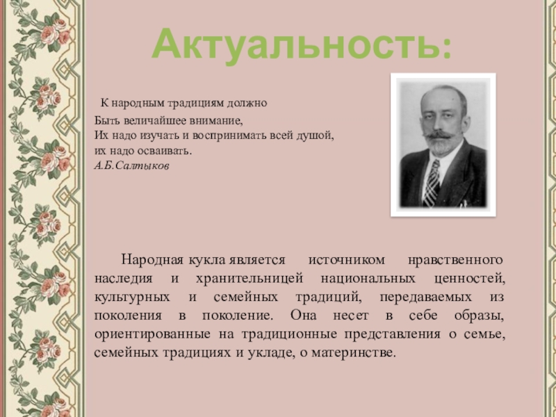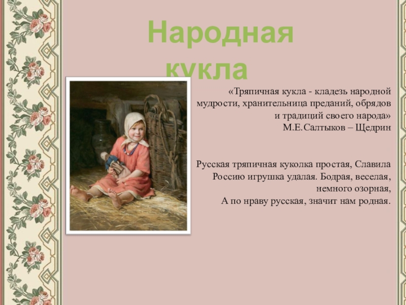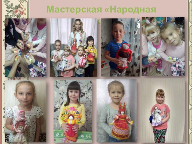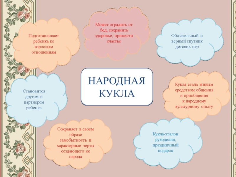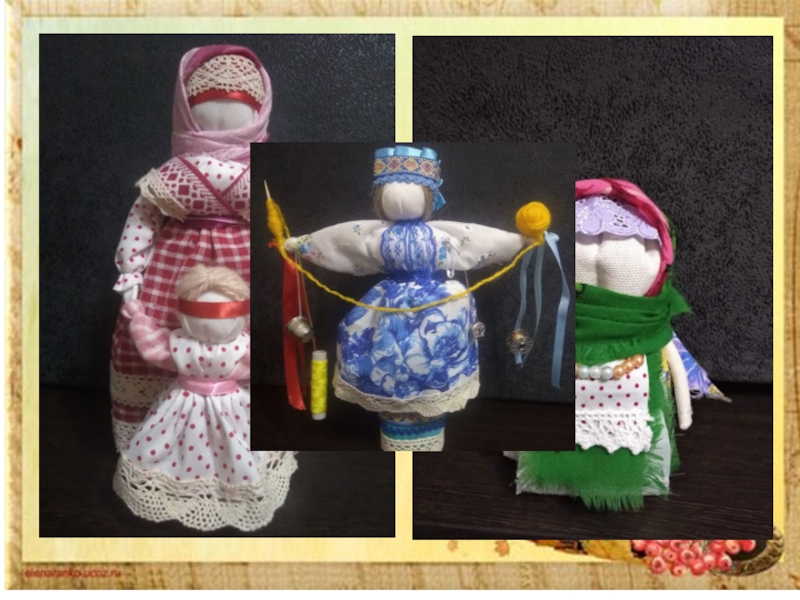 Народная кукла является источником нравственного наследия и хранительницей национальных ценностей, культурных и семейных традиций, передаваемых из поколения в поколение. Она несет в себе образы, ориентированные на традиционные представления о семье, семейных традициях и укладе, о материнстве.