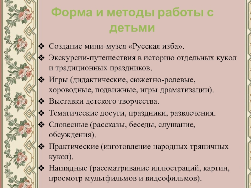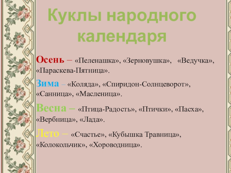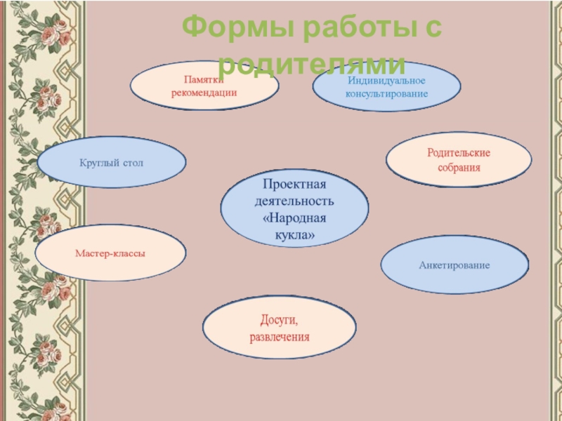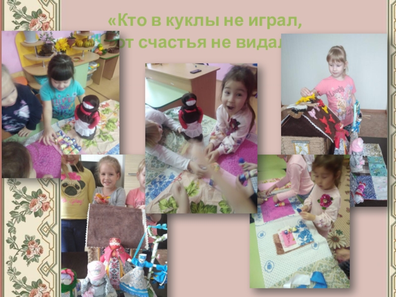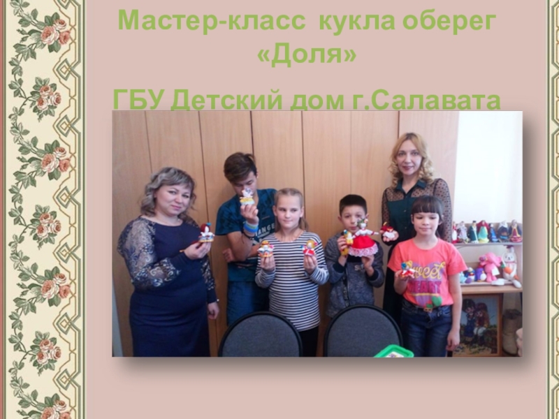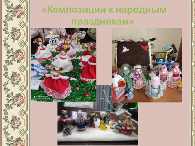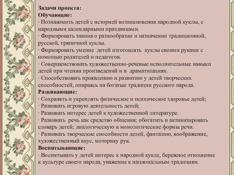 Народная кукла является источником нравственного наследия и хранительницей национальных ценностей, культурных и семейных традиций, передаваемых из поколения в поколение. Она несет в себе образы, ориентированные на традиционные представления о семье, семейных традициях и укладе, о материнстве.