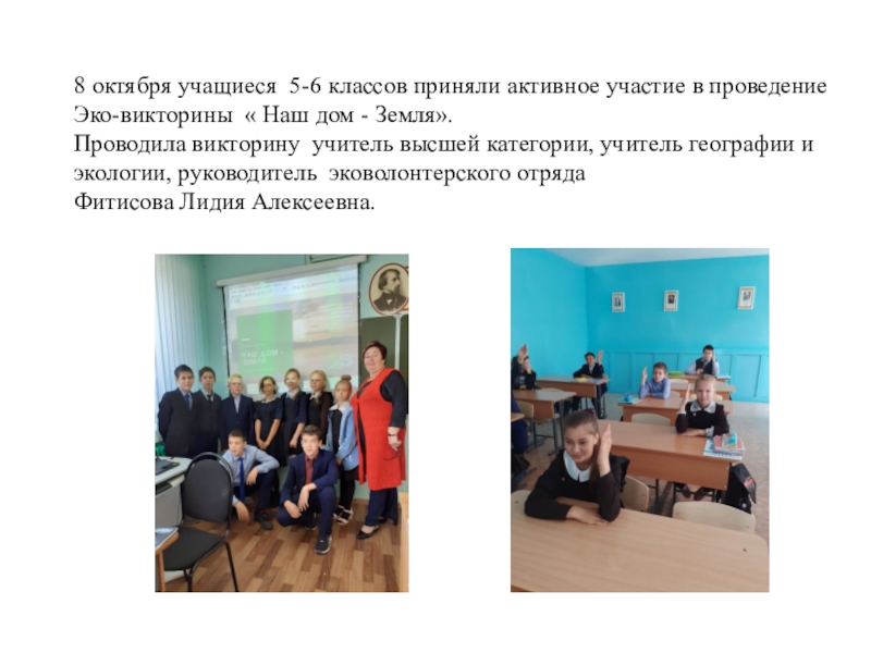 8 октября учащиеся 5-6 классов приняли активное участие в проведение Эко-викторины « Наш дом - Земля».Проводила викторину учитель высшей категории, учитель географии и экологии, руководитель эковолонтерского отрядаФитисова Лидия Алексеевна.