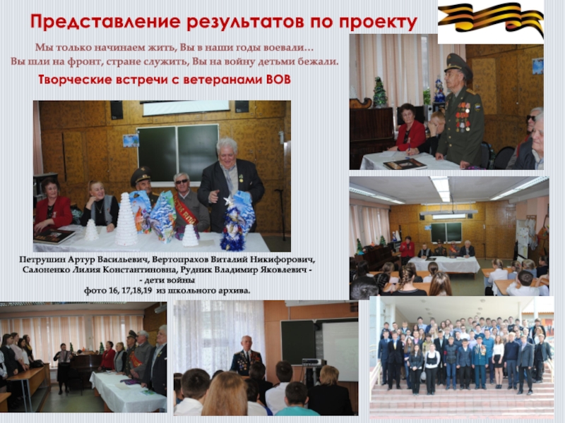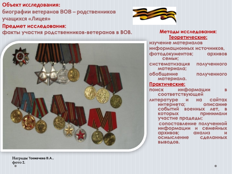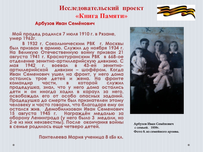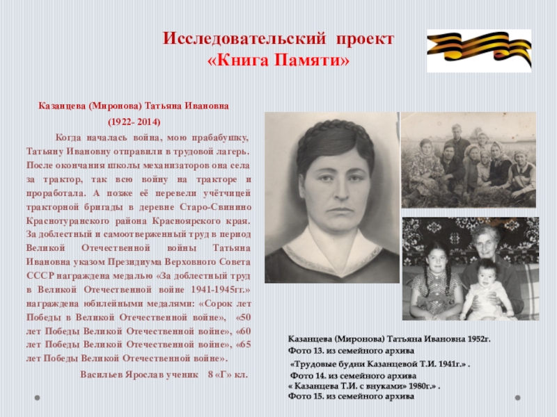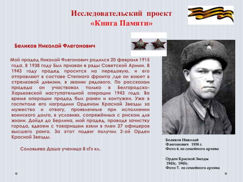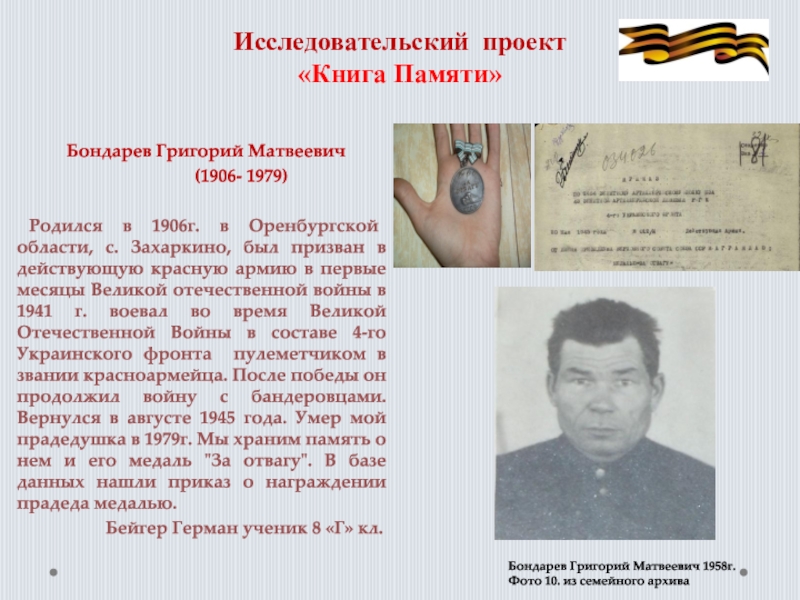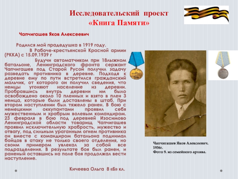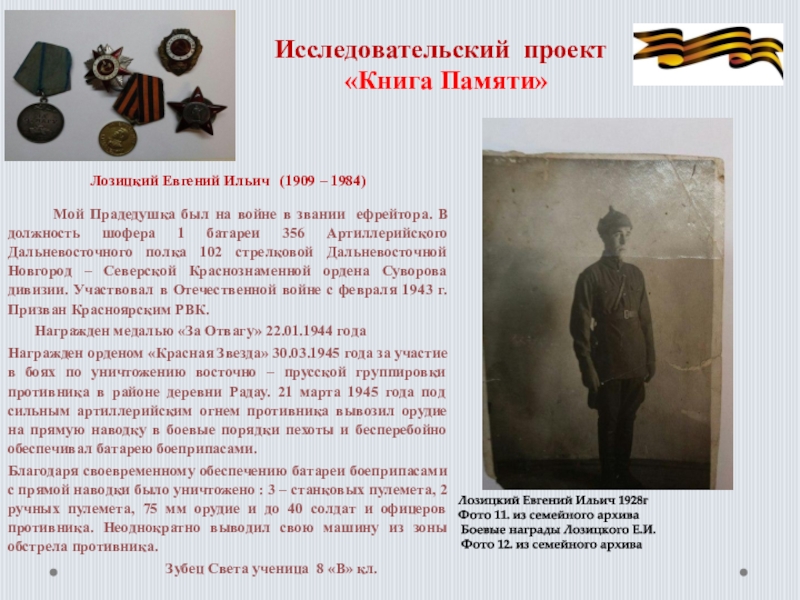«В самом углу на полке лежала коробка, бережно перевязанная ленточкой. По весу она оказалась тяжёлой. На мой вопрос: «Что там?», бабушка ответила: «Награды моего папы, твоего прадедушки». Я открыла коробку и увидела там большую красную ленту с надписью «Ветеран Великой Отечественной войны», а на ней прикреплённые ордена и медали. Их было 17. Своего прадедушку я знаю только по фотографиям. Знала, что он воевал, был даже ранен и… больше ничего».