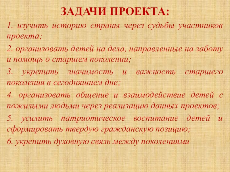 ЗАДАЧИ ПРОЕКТА:1. изучить историю страны через судьбы участников проекта; 2. организовать детей на дела, направленные на заботу