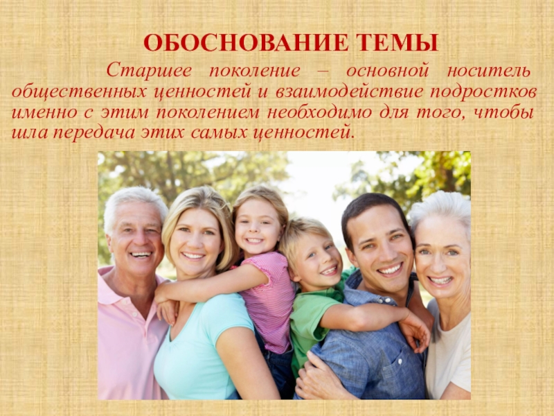 ОБОСНОВАНИЕ ТЕМЫ Старшее поколение – основной носитель общественных ценностей и взаимодействие подростков именно с этим поколением необходимо для того, чтобы шла передача этих самых ценностей.