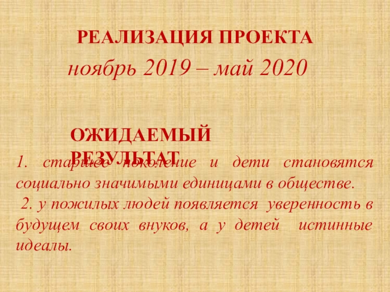 РЕАЛИЗАЦИЯ ПРОЕКТА ноябрь 2019 – май 2020	ОЖИДАЕМЫЙ РЕЗУЛЬТАТ1. старшее поколение и дети становятся социально значимыми единицами в
