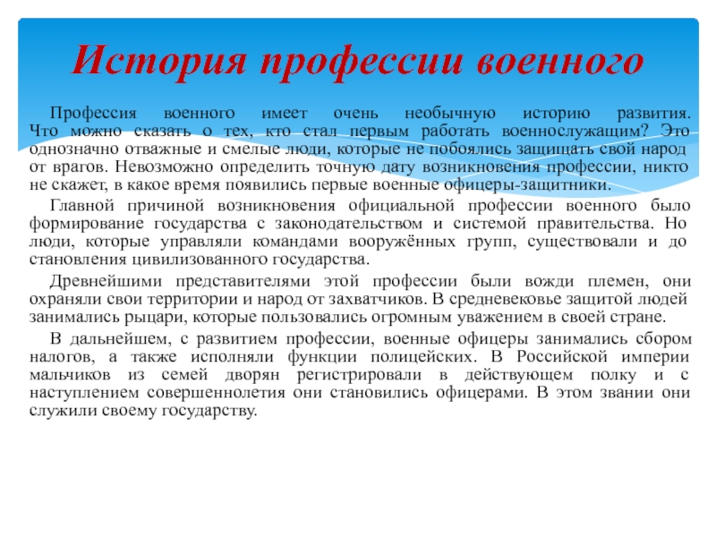 смелые люди, которые не побоялись защищать свой народ от врагов. Невозможно определить точную дату возникновения профессии, никто не скажет, в какое время появились первые военные офицеры-защитники.