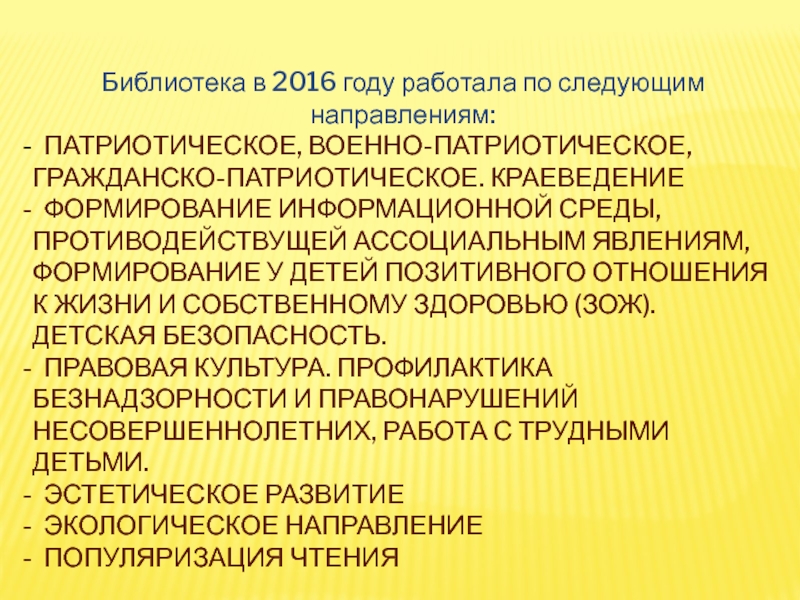 Библиотека в 2016 году работала по следующим направлениям: ПАТРИОТИЧЕСКОЕ, ВОЕННО-ПАТРИОТИЧЕСКОЕ, ГРАЖДАНСКО-ПАТРИОТИЧЕСКОЕ. КРАЕВЕДЕНИЕ ФОРМИРОВАНИЕ ИНФОРМАЦИОННОЙ СРЕДЫ, ПРОТИВОДЕЙСТВУЩЕЙ АССОЦИАЛЬНЫМ ЯВЛЕНИЯМ, ФОРМИРОВАНИЕ У ДЕТЕЙ ПОЗИТИВНОГО ОТНОШЕНИЯ К ЖИЗНИ И СОБСТВЕННОМУ ЗДОРОВЬЮ (ЗОЖ). ДЕТСКАЯ БЕЗОПАСНОСТЬ.