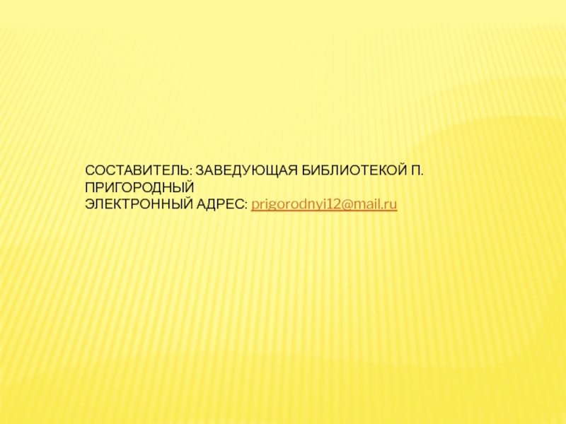СОСТАВИТЕЛЬ: ЗАВЕДУЮЩАЯ БИБЛИОТЕКОЙ П. ПРИГОРОДНЫЙЭЛЕКТРОННЫЙ АДРЕС: prigorodnyi12@mail.ru