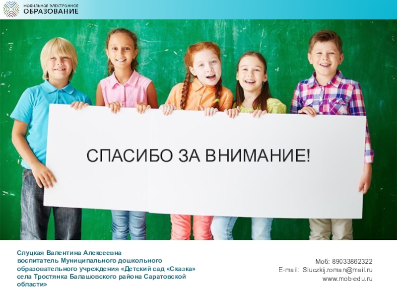 СПАСИБО ЗА ВНИМАНИЕ!Слуцкая Валентина Алексеевнавоспитатель Муниципального дошкольного образовательного учреждения «Детский сад «Сказка» села Тростянка Балашовского района Саратовской