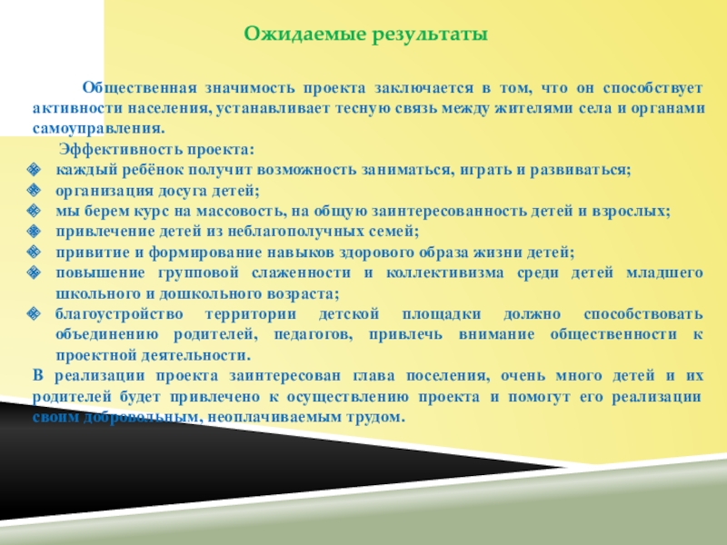 который уже имеется на территории Колхозного сада не справляется с потоком детей, поэтому стоит вопрос создать игровую детскую площадку на свежем воздухе, под солнышком, куда может прийти каждый ребенок и провести своё свободное время. Не каждый родитель может позволить отдых в оздоровительных учреждениях с маленькими детьми, а младшим школьникам отдохнуть в детском учреждении за пределами села. А игровая площадка будет местный островок детского отдыха, веселья и смеха, туда будет доступно прийти каждому ребенку села. Тем более этот проект будет использоваться круглогодично. В зиму он будет являться уголком детского творчества, где дети смогут под руководством взрослых строить снежные фигуры и ледяные горки.