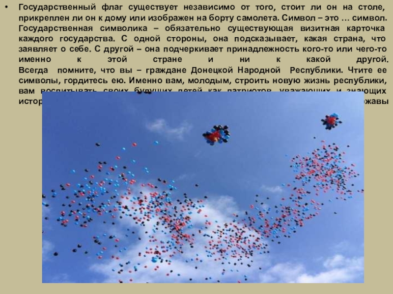 флага. Что же получается, что полотнища сами по себе, а Государственный флаг – сам по себе? И да, и нет! Дело в том, что Государственный флаг – это один из государственных символов. А символ не всегда осязаем. То есть государственный символ – Государственный флаг – может существовать без древка с прикрепленной к нему тканью.
