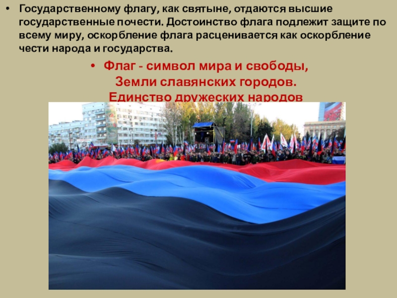 Слайд 7Государственному флагу, как святыне, отдаются высшие государственные почести. Достоинство флага