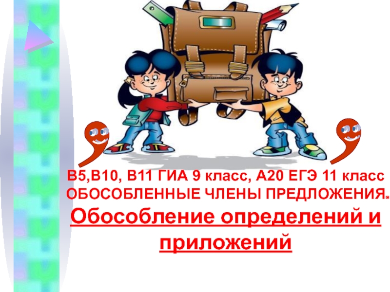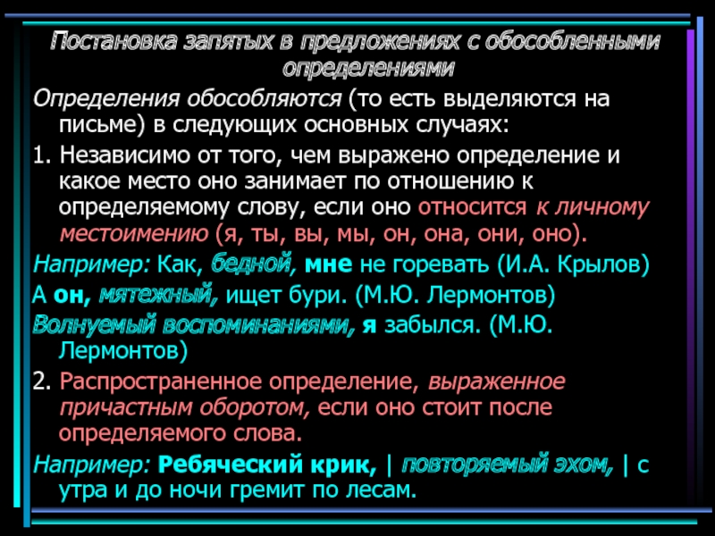 Слайд 10Постановка запятых в предложениях с обособленными определениями