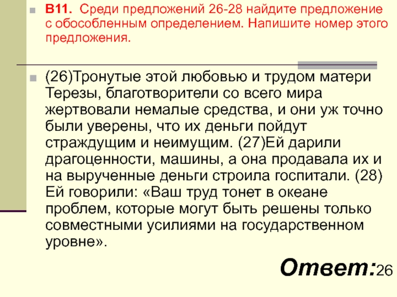 Слайд 22В11. Среди предложений 26-28 найдите предложение с обособленным определением. Напишите