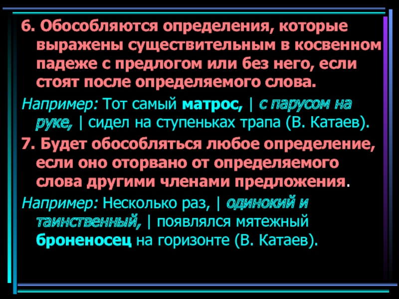 7. Будет обособляться любое определение, если оно оторвано от определяемого слова другими членами предложения.