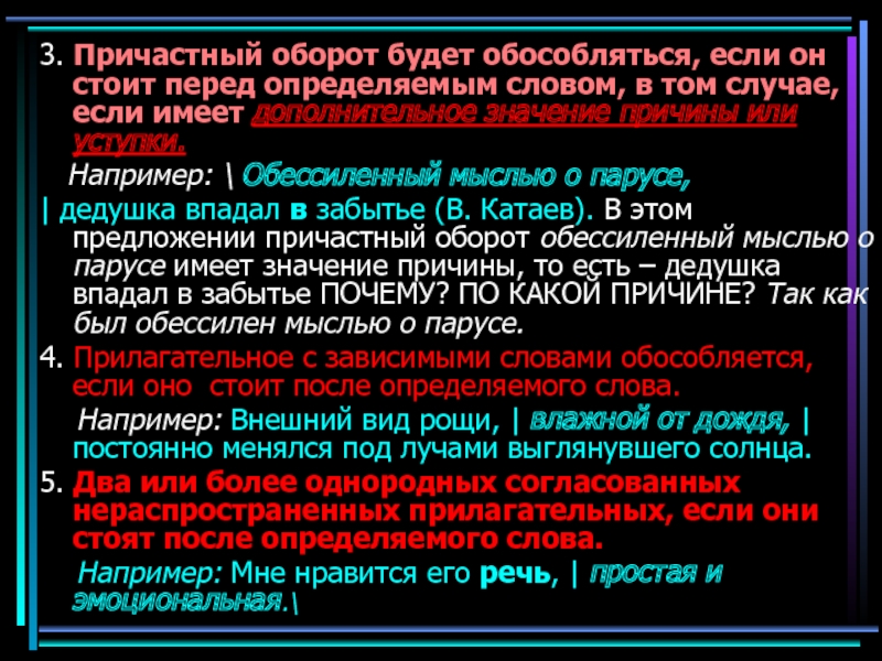 | дедушка впадал в забытье (В. Катаев). В этом предложении причастный оборот обессиленный мыслью о парусе имеет значение причины, то есть – дедушка впадал в забытье ПОЧЕМУ? ПО КАКОЙ ПРИЧИНЕ? Так как был обессилен мыслью о парусе.