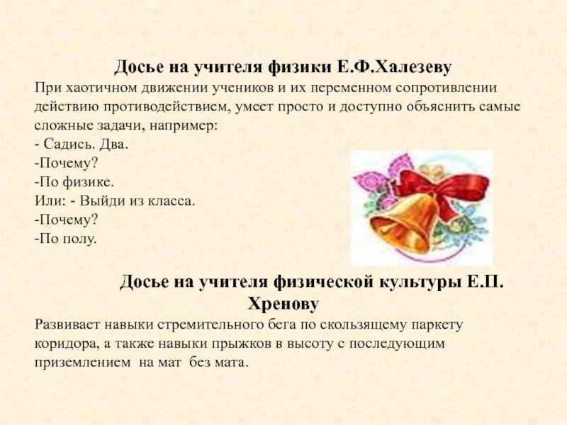 Слайд 44Досье на учителя физики Е.Ф.Халезеву