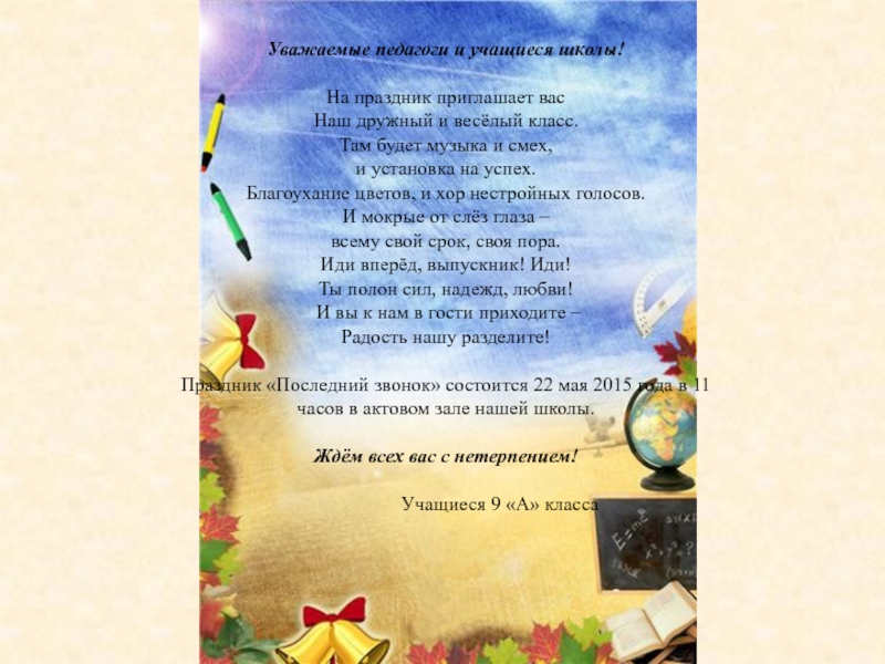 Праздник «Последний звонок» состоится 22 мая 2015 года в 11 часов в актовом зале нашей школы.