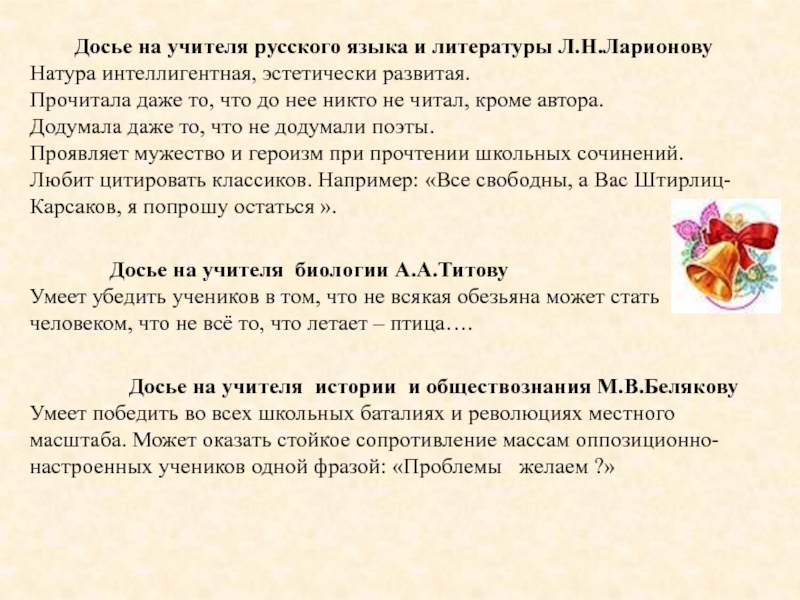 Слайд 42Досье на учителя русского языка и литературы Л.Н.Ларионову