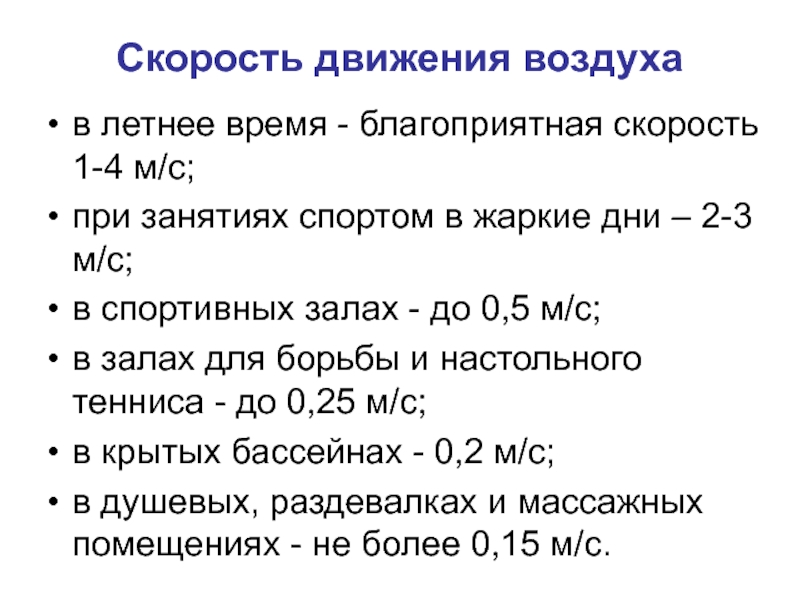 в душевых, раздевалках и массажных помещениях - не более 0,15 м/с.