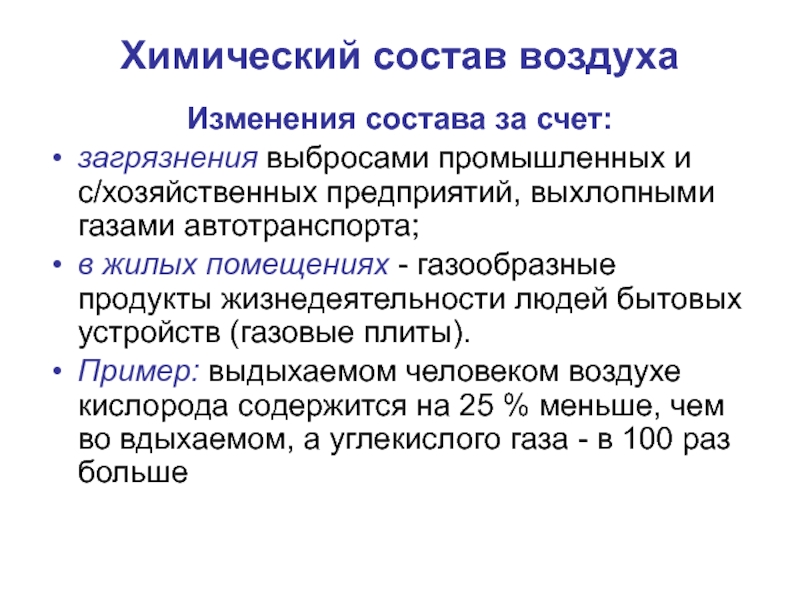 Пример: выдыхаемом человеком воздухе кислорода содержится на 25 % меньше, чем во вдыхаемом, а углекислого газа - в 100 раз больше