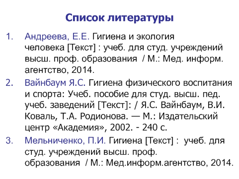 Мельниченко, П.И. Гигиена [Текст] : учеб. для студ. учреждений высш. проф. образования / М.: Мед.информ.агентство, 2014.
