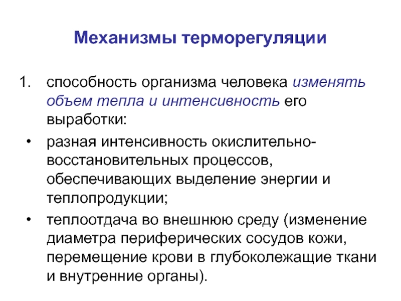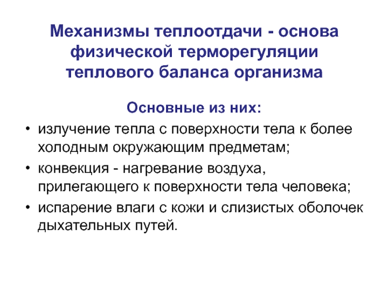 Слайд 13Механизмы теплоотдачи - основа физической терморегуляции теплового баланса организма