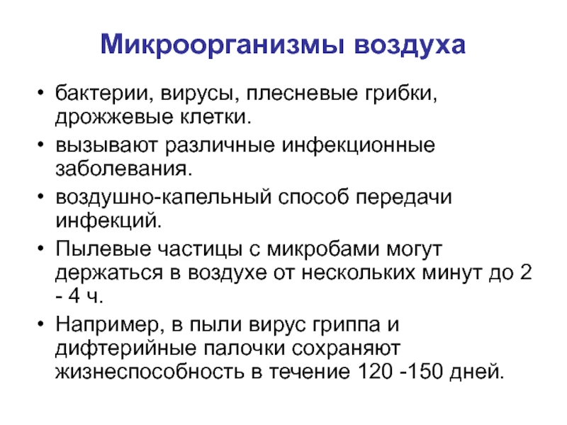 Например, в пыли вирус гриппа и дифтерийные палочки сохраняют жизнеспособность в течение 120 -150 дней.