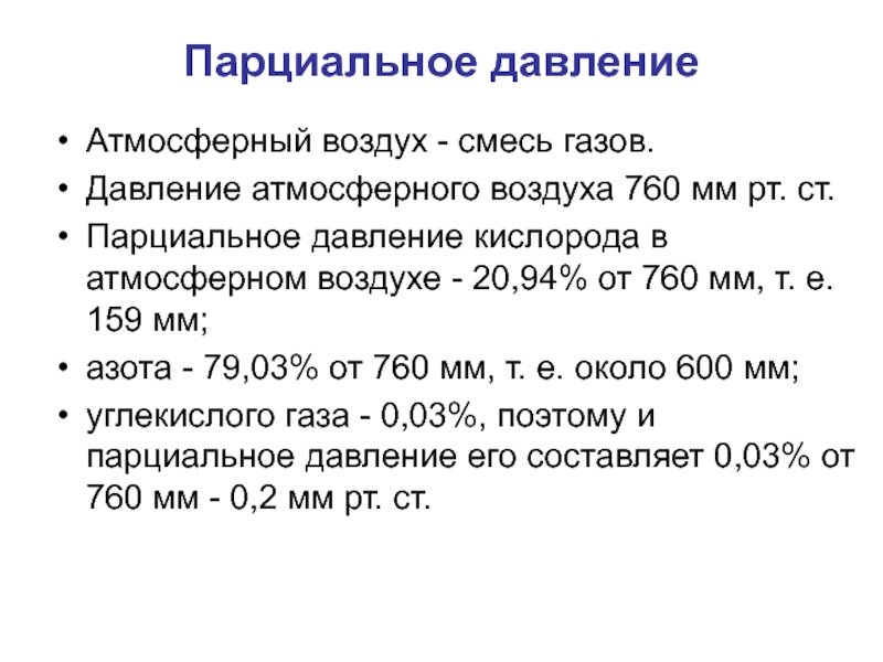 углекислого газа - 0,03%, поэтому и парциальное давление его составляет 0,03% от 760 мм - 0,2 мм рт. ст.