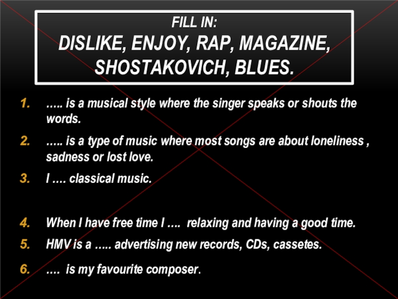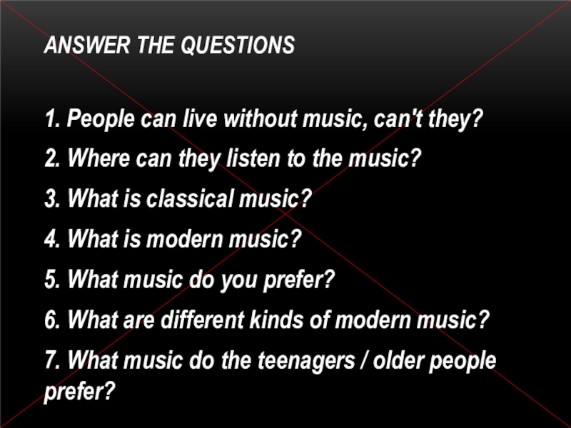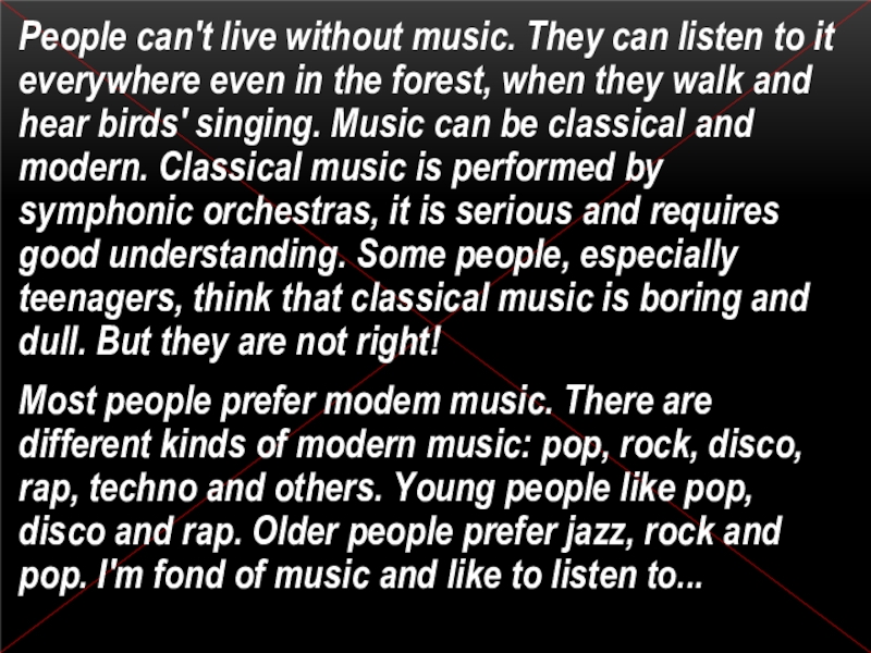 Most people prefer modem music. There are different kinds of modern music: pop, rock, disco, rap, techno and others. Young people like pop, disco and rap. Older people prefer jazz, rock and pop. I'm fond of music and like to listen to...