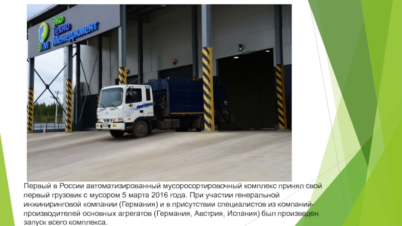Слайд 3Первый в России автоматизированный мусоросортировочный комплекс принял свой первый грузовик