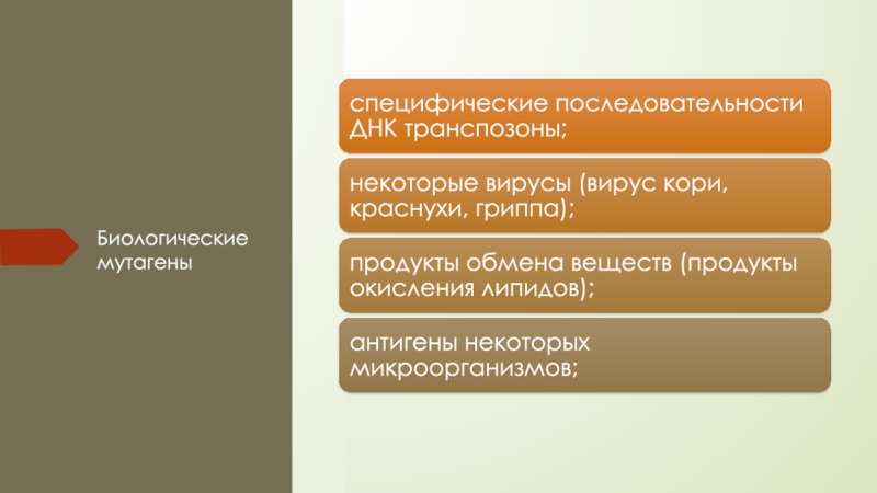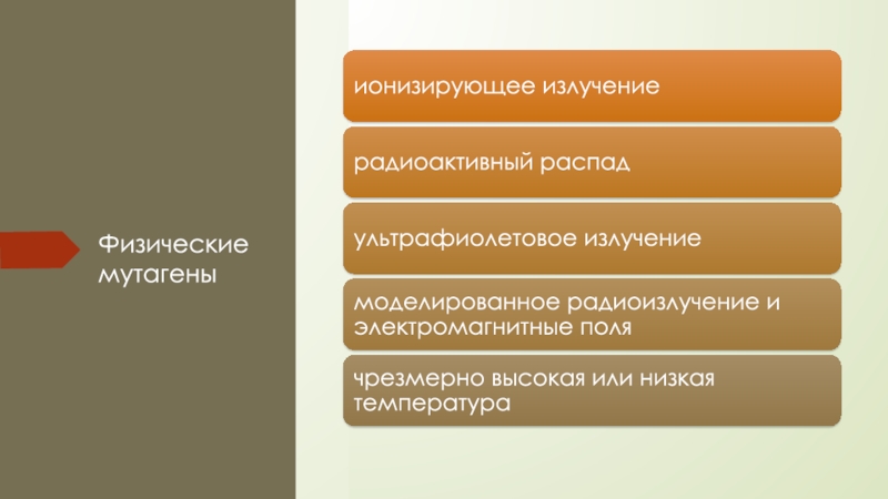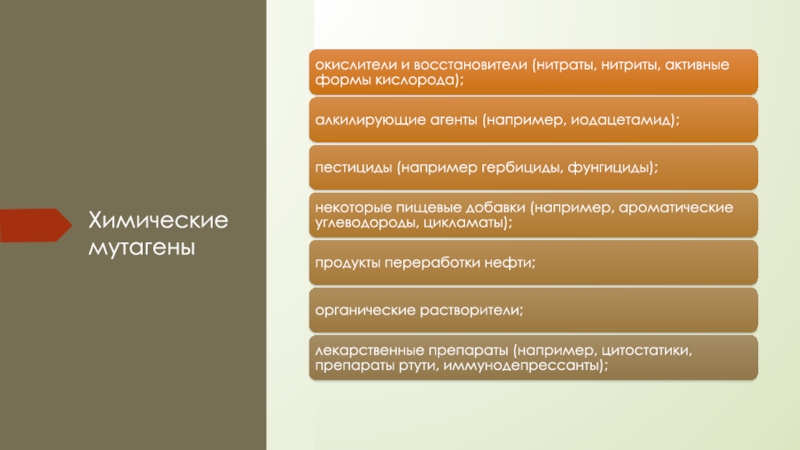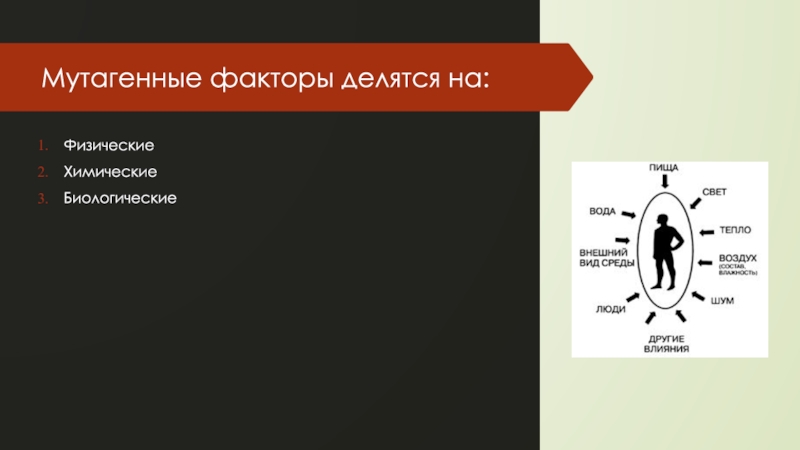 Слайд 2 Мутагенные факторы (мутагены) это факторы, вызывающие мутации. По происхождению мутагены классифицируют на эндогенные, образующиеся в