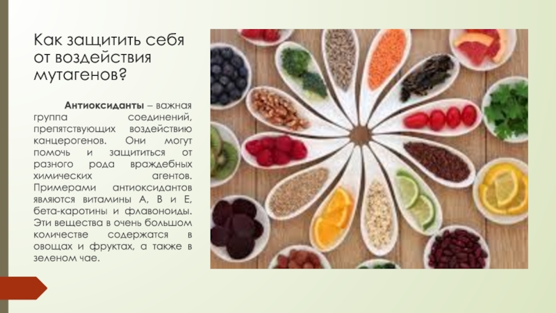 Антиоксиданты – важная группа соединений, препятствующих воздействию канцерогенов. Они могут