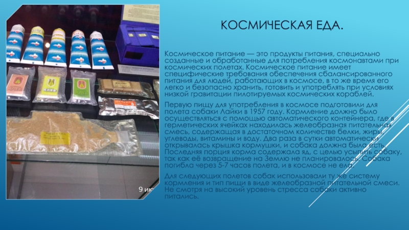 Первую пищу для употребления в космосе подготовили для полета собаки Лайки в 1957 году. Кормление должно было осуществляться с помощью автоматического контейнера, где в герметических ячейках находилась желеобразная питательная смесь, содержащая в достаточном количестве белки, жиры, углеводы, витамины и воду. Два раза в сутки автоматически открывалась крышка кормушки, и собака должна была есть. Последняя порция корма содержала яд, с целью усыпить собаку, так как её возвращение на Землю не планировалось. Собака погибла через 5-7 часов полета, и в космосе не ела.