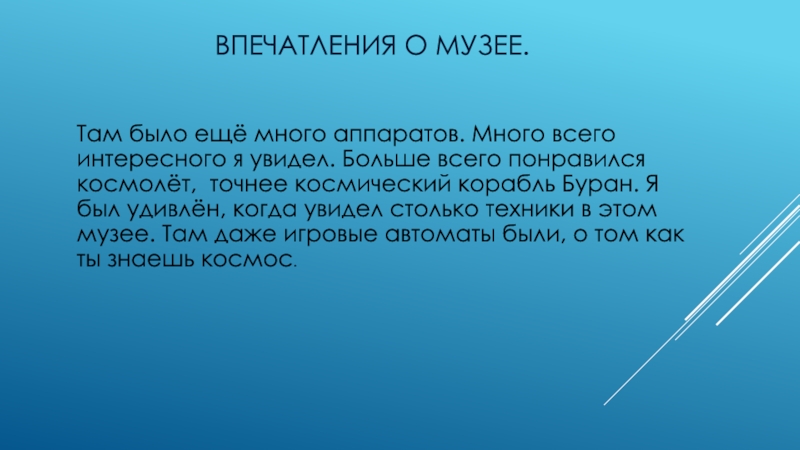 Я был удивлён, когда увидел столько техники в этом музее. Там даже игровые автоматы были, о том как ты знаешь космос.